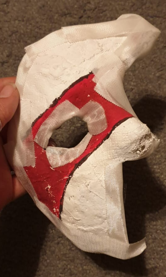 Mijn eerste echte experiment was het maken van het masker hiernaast. Ik heb het geprobeerd te verven, alleen de verf liet los. Het is nog niet af, de randen zijn nu af geplakt met tape om het minder scherp te maken.