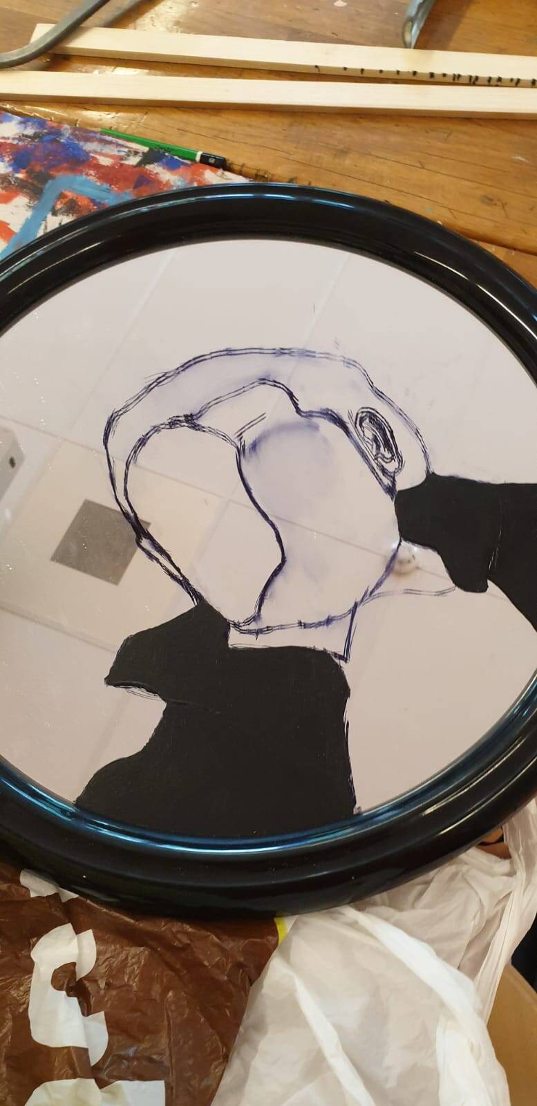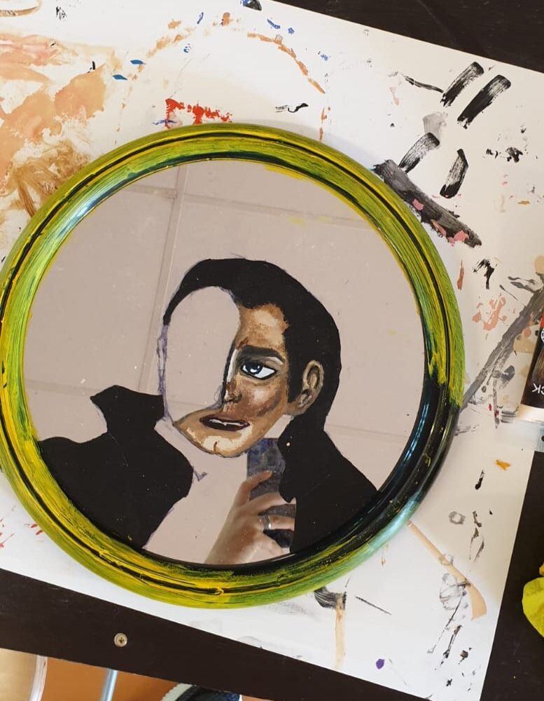 Ik begon met een laag pure huid kleurige verf. Omdat een spiegel zo glad is, bleef de verf moeilijk zitten, hierdoor duurde het erg lang voordat ik een extra laag kon toevoegen.
