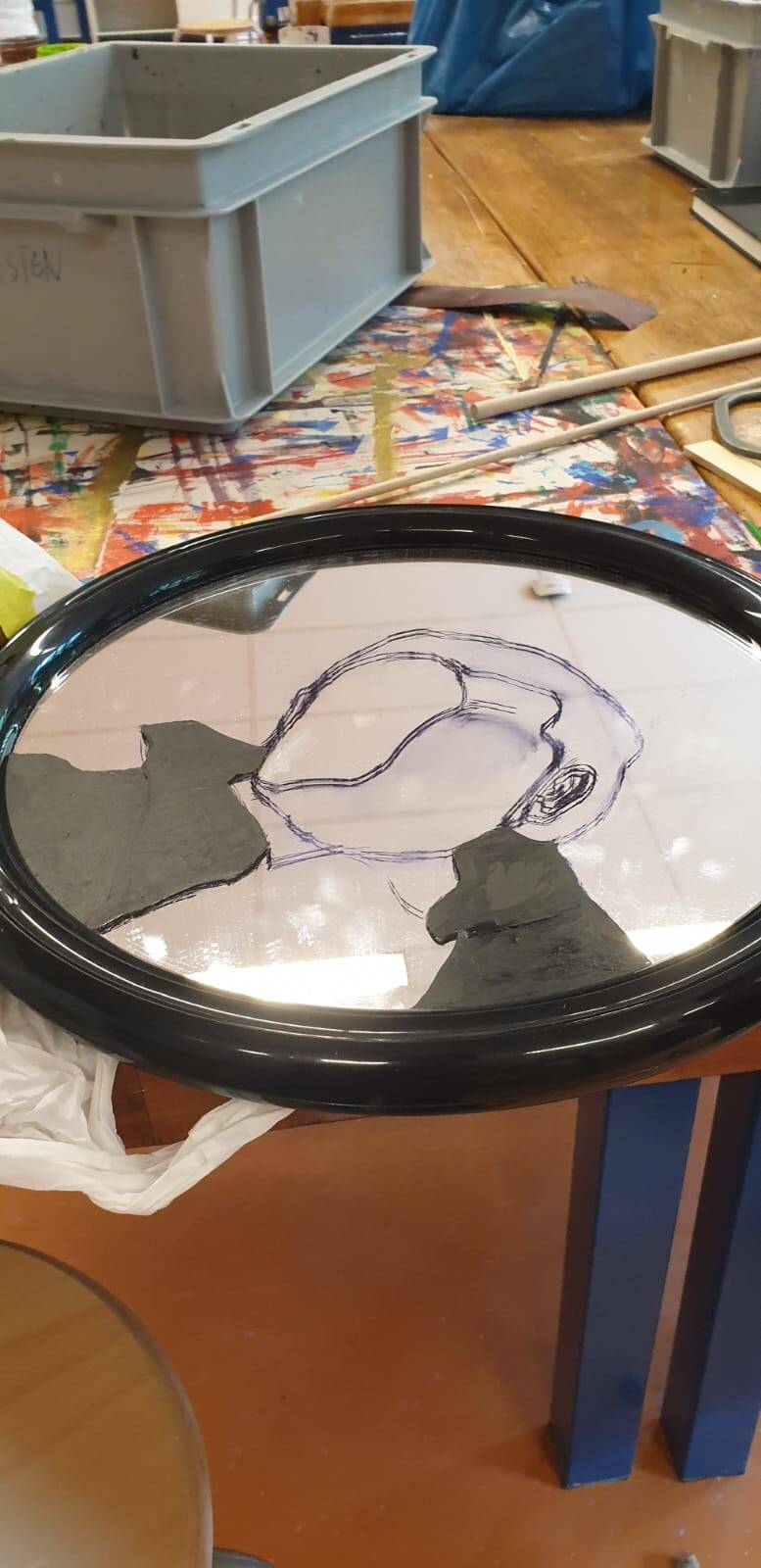 Vandaag gaf me wat meer zelfvertrouwen. Ik begon met het maken van een schets op het glas. Hiervoor gebruikte ik een CD-marker op aanraden van mevrouw de Vries. Het gaf een beetje vlekken, maar die waren makkelijk te verwijderen. Voor het maken van de grens gebruikte ik een aantal foto's  van de phantom, die ook op mijn pinterest bord staan.