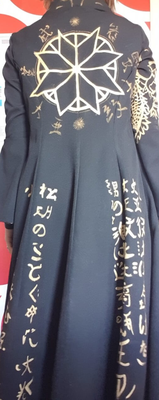 Ik zou graag 1 mooie foto willen zien, maar de photoshoot is helaas mislukt. De twee bovenstaande foto's zijn de foto's die mijn jurk en jas het beste laten zien. Ik ben erg tevreden met het resultaat en hoop het nog verder te verbeteren, voornamelijk de tekens op de rug.