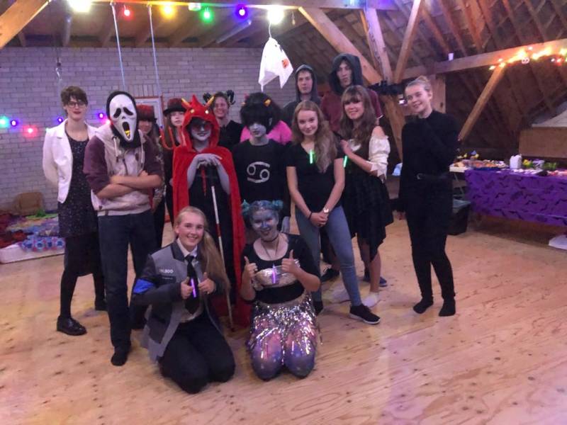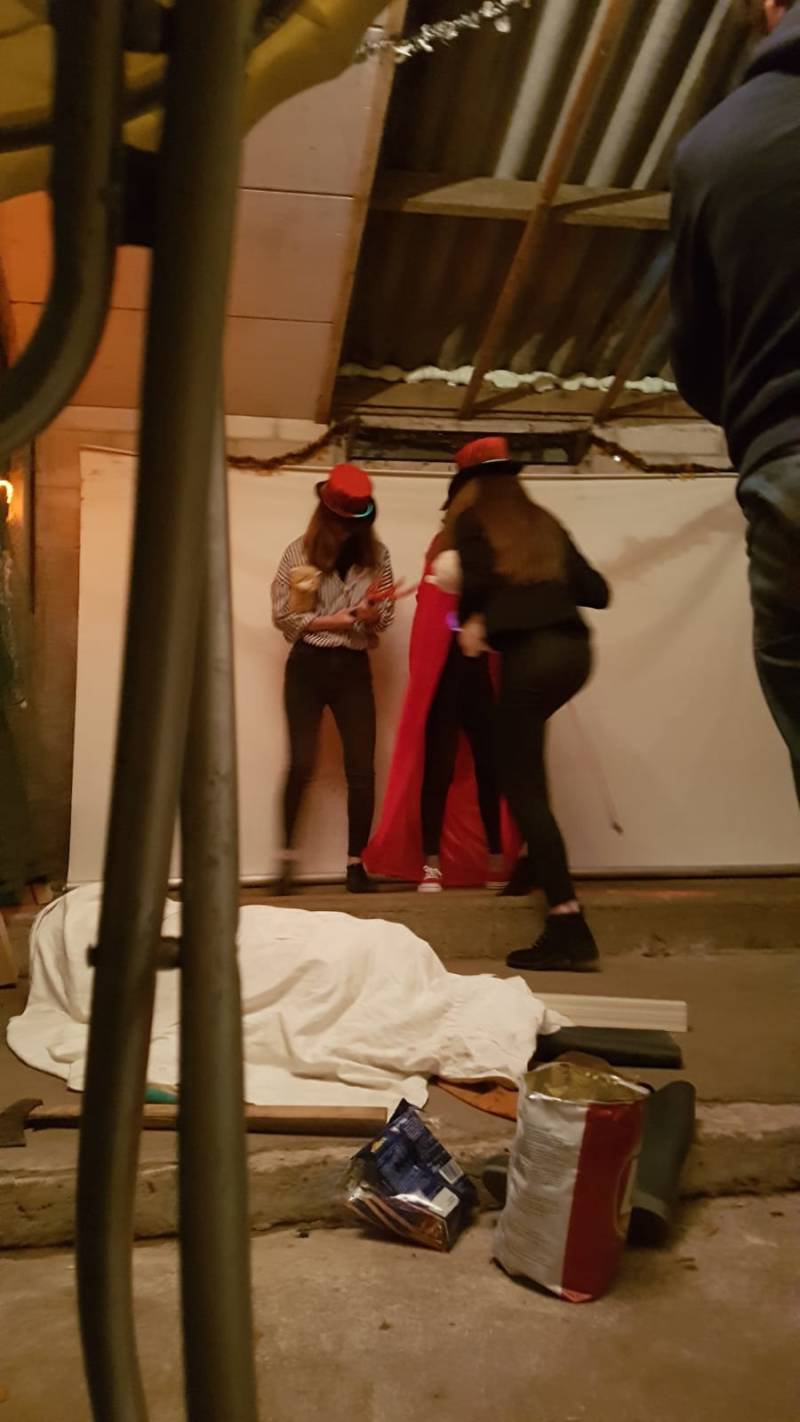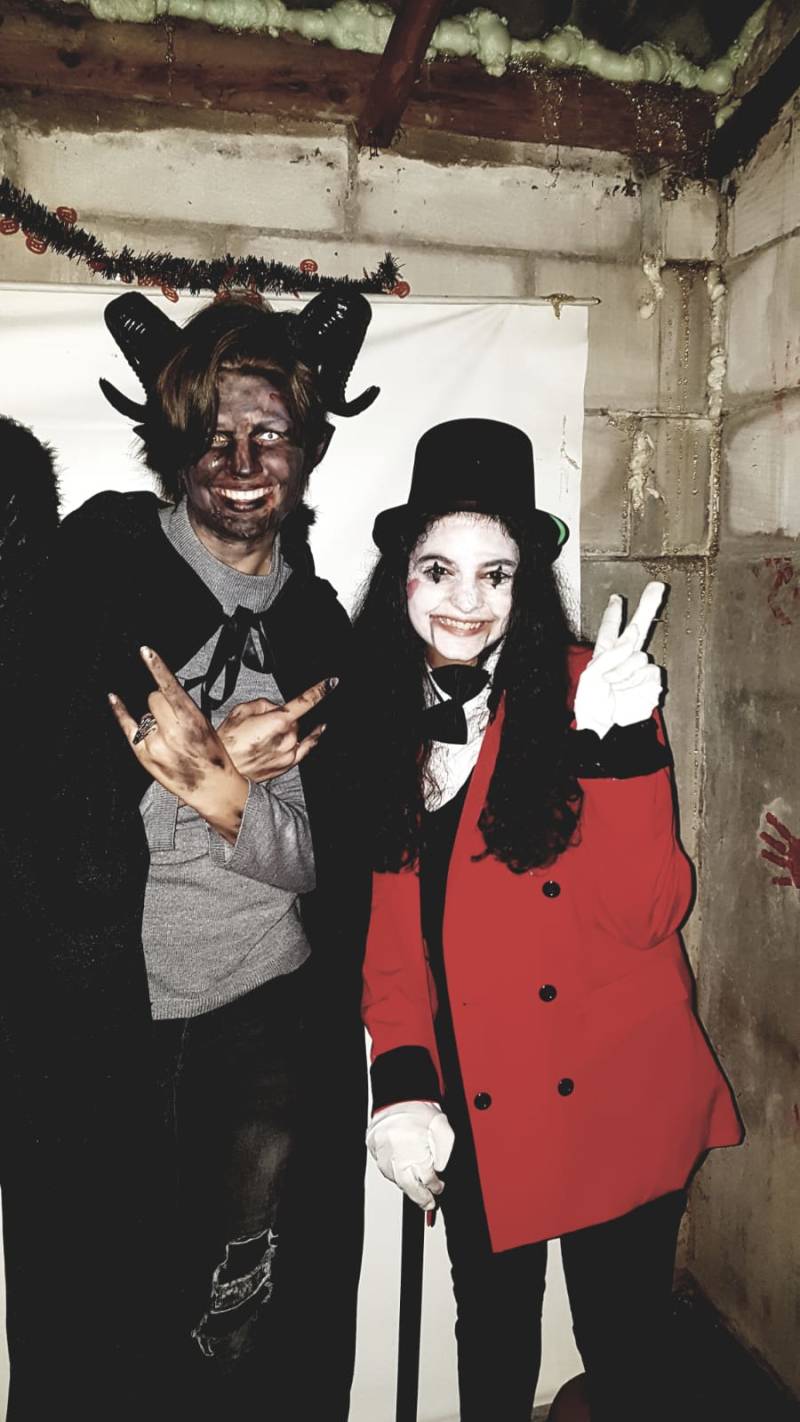 Naast het verhaal en de "zaal" is een Halloween feestje niet compleet zonder een kostuum, daarnaast is een kostuum ook een soort model. Dit jaar was de eerste keer dat ik een uitgebreid kostuum zou gaan maken, het is niet helemaal geworden hoe ik het zou willen. Ik ben van plan volgend jaar verder te gaan met mijn huidige kostuum, maar het dan veel uitgebreider te maken dan ik dit jaar had. Een plaatje hierboven laat een foto zien van mijn kostuum naast die van een vriendin (verkleedt als Brendon Urie ;)) Ik had 2 feestjes, maar maar 1 kostuum. Om afwisseling te creëren, heb ik verschillende soorten kleding stukken aangetrokken. Bij het eerste feestje een broek en een grijze trui en bij het andere feestje een jurk. Van het tweede feestje zijn helaas niet zo heel veel foto's gemaakt, daarom heb ik geen goed beeld van hoe mijn kostuum er toen heeft uitgezien. Bij mijn eigen feestje was de schmink een beetje uit de hand gelopen. Door al deze problemen is de foto hierboven die enige acceptabele foto.