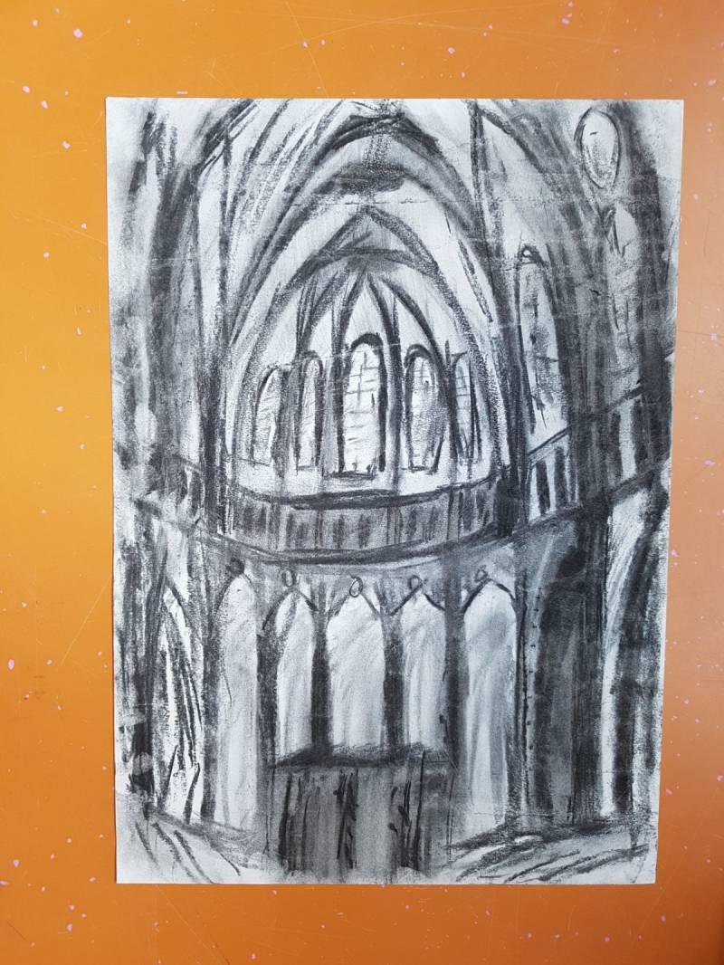 Veel BV lessen zijn de afgelopen maand uitgevallen, toch ben ik bezig geweest met de hemelgewelven. Ik ben begonnen met het experimenteren met verschillende materialen. Te beginnen bij houtskool. In de les zijn we bezig geweest met het nateken (met houtskool) van een hemelgewelf (resultaat hier onder). Verder ben ik thuis met potlood aan een ander ontwerp begonnen, deze heb ik niet helemaal afgemaakt, maar de grote lijnen zijn zichtbaar. Een andere les op school zijn we bezig geweest met ecoline, helaas heb ik hier geen foto van kunnen maken, omdat ik hem kwijt ben geraakt.