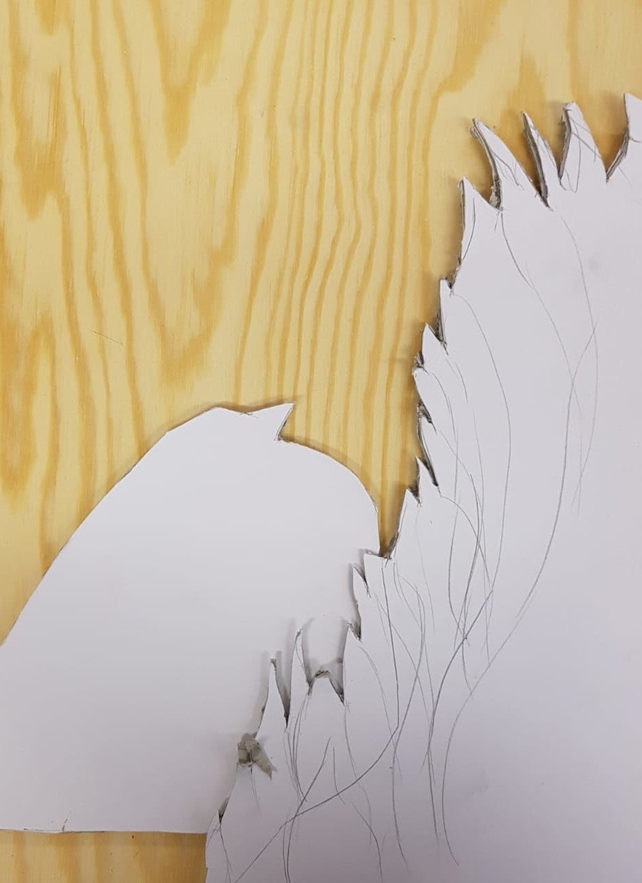 Na het bedenken van het idee, moest ik de materialen gaan bedenken waar ik mee wilde werken. Ik wilde iets anders dan hout, dan gebruikte ik elke keer al. Ik had graag met klei willen werken, allen daar was het al te laat voor. Later kwam ik uit op karton. Ik had hier nog nooit mee gewerkt, dus dat werd een nieuwe uitdaging voor mij. Met karton werken leek me leuk, nieuw en interessant, daarnaast vond ik het goed bij Melovin passen. Je denkt dat het zacht en soepel materiaal is, maar het is eigenlijk best wel sterk en moeilijk uit te snijden.
