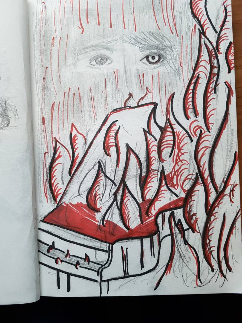 Na de pen tekening ben ik begonnen met het echte werk. Ik heb allerlei schetsen gemaakt van dingen die ik erin wilde hebben. Dit zijn simpele schetsen. Daarna ben ik begonnen met het schetsen van het werk dat ik wilde gaan maken. Een Piano die in het vuur staat en uit de rook kwamen dan de ogen van Melovin, zijn "fantasie" wereld.