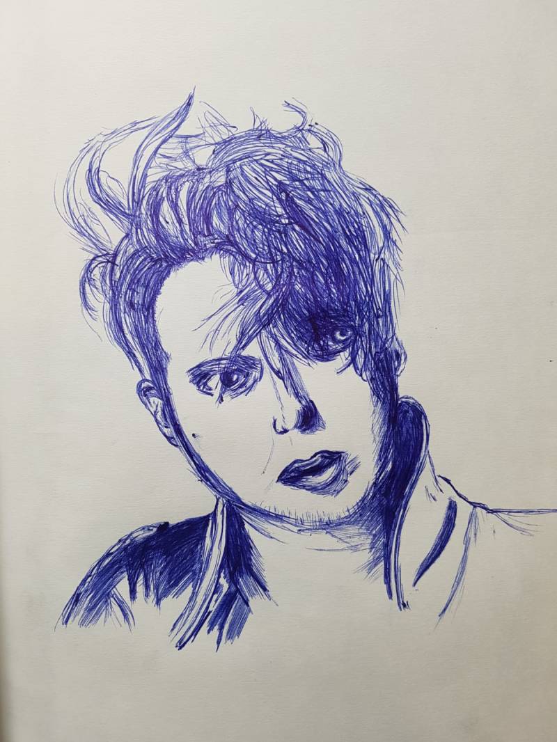 Het liefst zou ik Melovin willen tekenen, maar dat was te simpel. Toch heb ik een tekening van hem gemaakt met pen. Als ik lang naar iets kijk of ergens mee bezig ben, doe ik vaak inspiratie op.