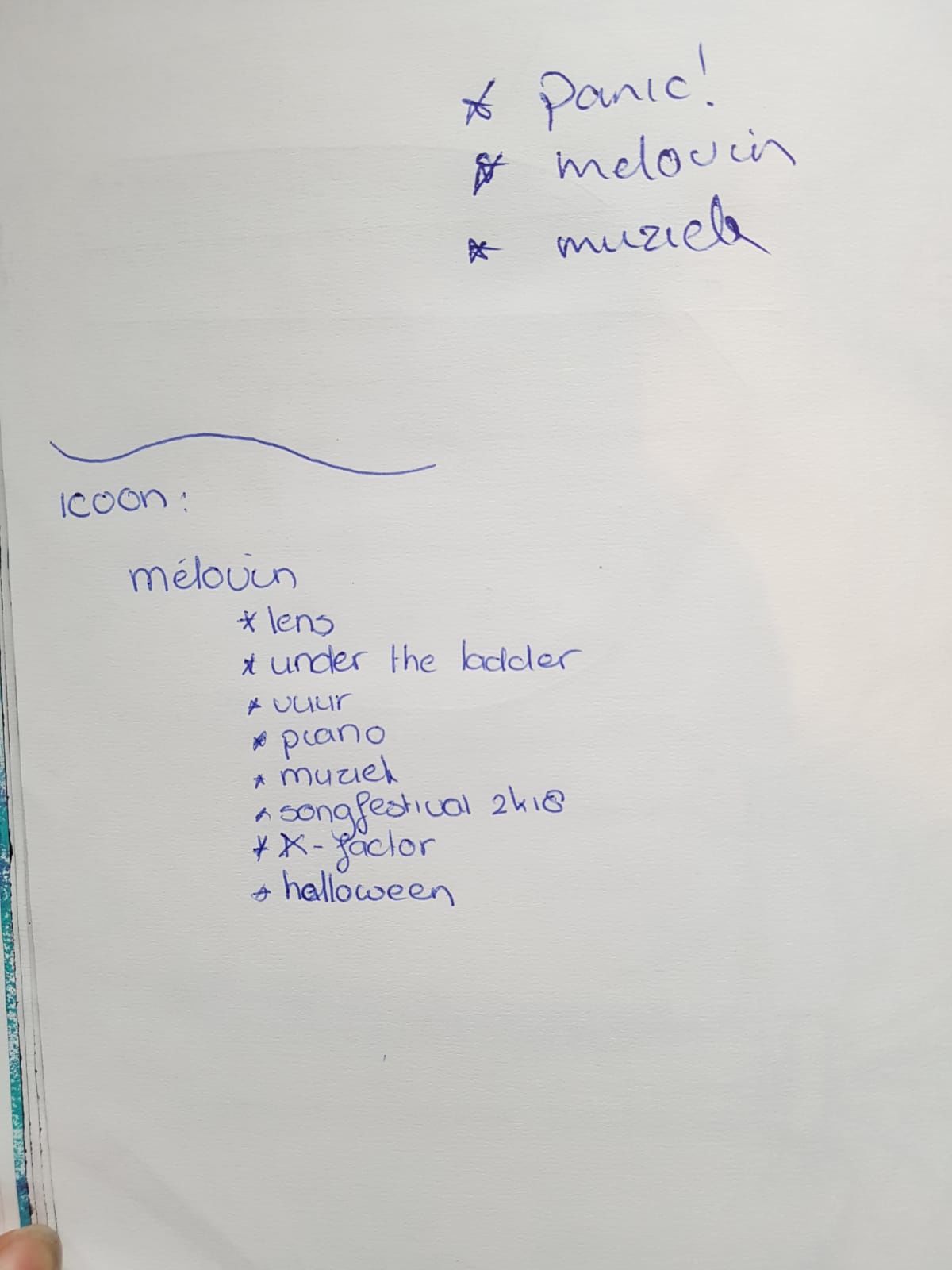 Eerst begon met het opschrijven van ideeën. Ik wilde het over Panic! of over Melovin hebben.