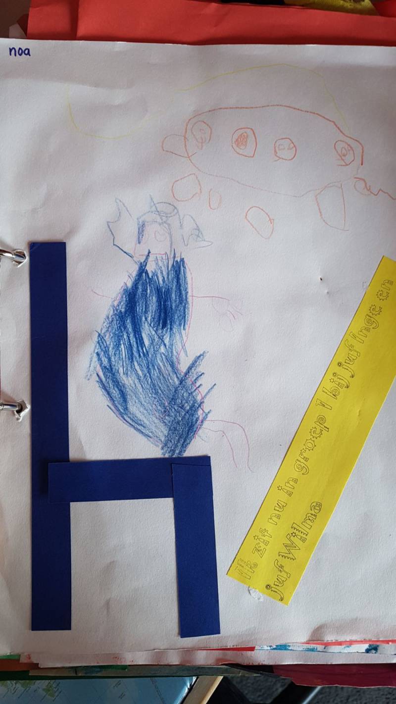 Mijn eerste knutselwerkje van de basisschool. Volgens mij moet ik het voorstellen die op een stoel in de klas zit. Op het gele papiertje staat "ik zit in groep 1 bij juf Inge en juf Wilma". Zij zijn mijn juffen geweest.