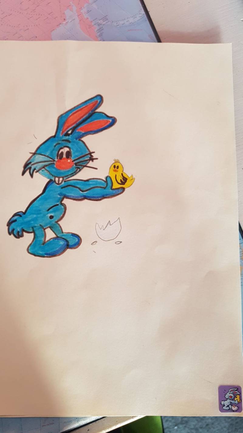 Dit zijn twee tekeningen die ik in groep 7 heb gemaakt. Links is de paashaas of in ieder geval een konijn die iets met Pasen te maken heeft. Deze tekening heb ik nagemaakt van een sticker. De tekening rechts heb ik wel zelf bedacht.