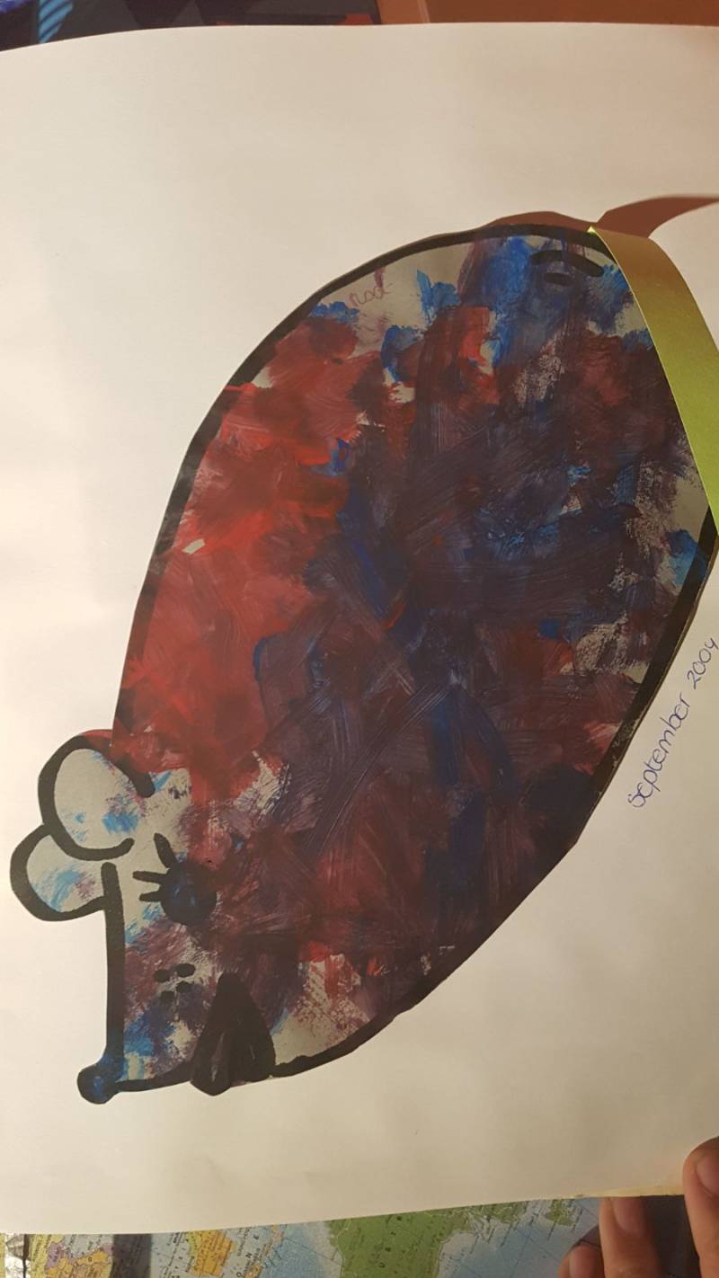 Ik laat niet alles van die 2 jaar zien, want ik heb 2 mappen vol met knutsels. Veel van deze knutsels zijn een paar strepen verf op het papier, of een aantal stukjes papier op weer een ander stuk papier. Andere zijn weer vader- of moederdag cadeautjes, zoals een uitgeknipte stropdas beplakt met stukjes papier. Weer een andere is een masker die ik had gemaakt voor carnaval.