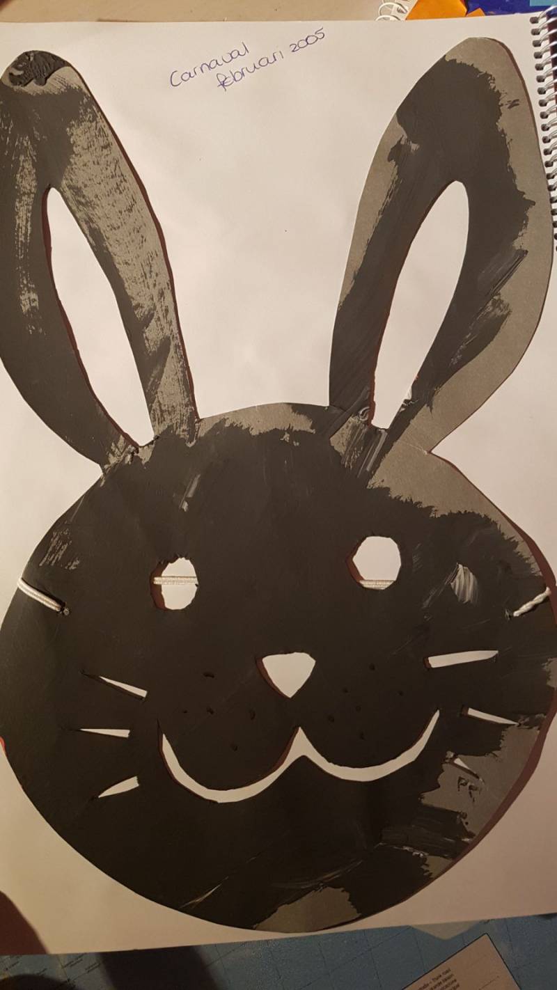 Dit is het masker voor carnaval. Volgens mij heb ik hem alleen zelf geverfd, want ik denk niet dat ik op die leeftijd al zo goed kon knippen.